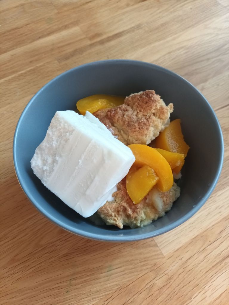 I ett avsnitt av 2 and a half men äter Alan en Peach cobbler. Jag blev inspirerad och ville testa att laga det hemma. Det gick inte hem hos sonen och knappt hos mig. Degen blev lite för kompakt för min smak i en sån här anrättning. En annan gång ska jag nog testa att göra degen mer lik smulpaj och minska mängden sockerlag. Då blir nog proportionerna bättre.