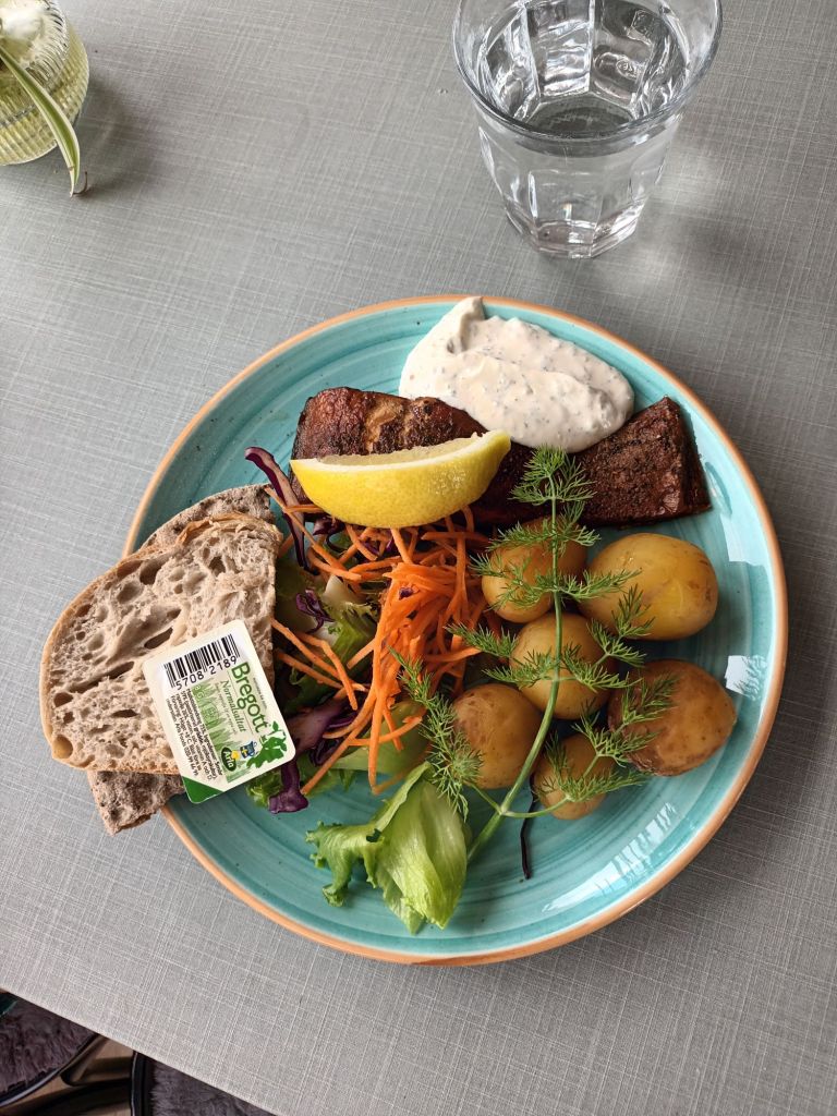 Sonen valde pannkakor medan jag testade en kombination av Katthammarsviks rökeris fisktallrik. Man kombinerar ihop sin måltid själv med olika val. Jag valde varmrökt citronlax med kokt potatis och romsås.