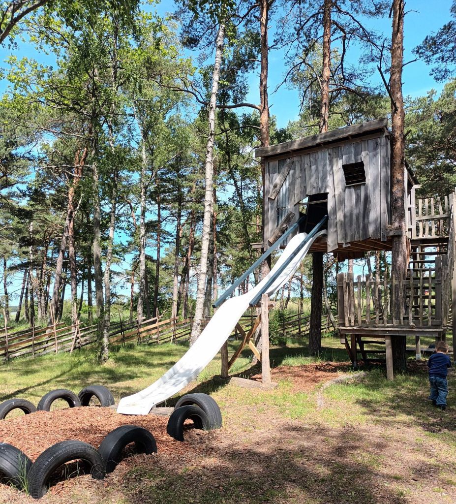 Äventyrsbyn hade en camping där inträdet till äventyrsbyn ingick, men det kändes inte som att det hade passat oss att bo här under veckan. Dels är läget lite avsides och dels så kändes det som att det kanske hade varit enklare om barnen var lite äldre. För min son som har mycket energi och älskar att klättra fanns här mycket att utforska. Kojor, rutschbana, studsmatta, gungor, sandlåda m.m.