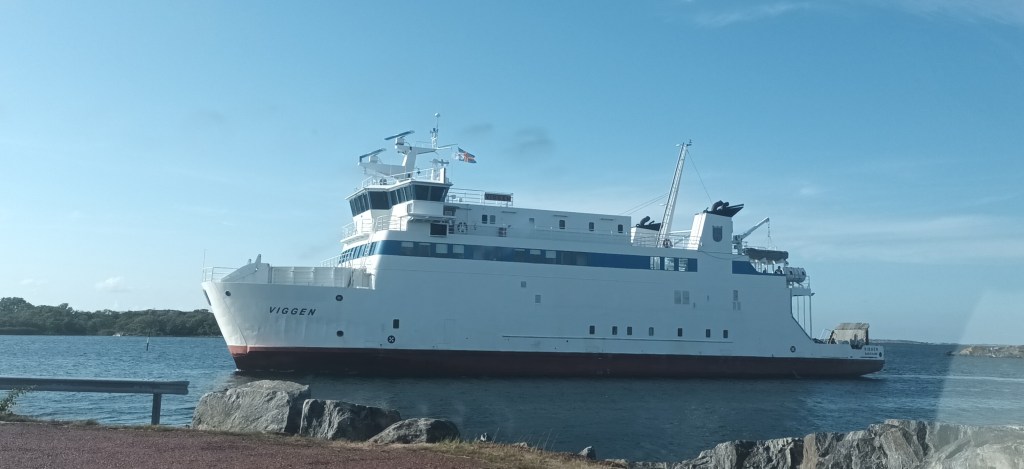 Nere vid färjfästet i Harparnäs såg vi m/s Viggen anlända. Den går på en annan linje just nu, men längre fram ska även vi få åka med den färjan när den flyttar till vår hemmalinje.