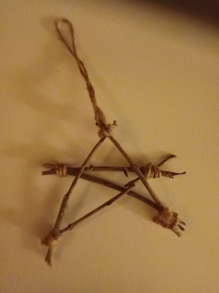 Jag hade ambitionen att göra en juldekoration med kottar men jag hann inte ut och plocka kottar innan snön kom så det fick bli en stjärna av pinnar istället.