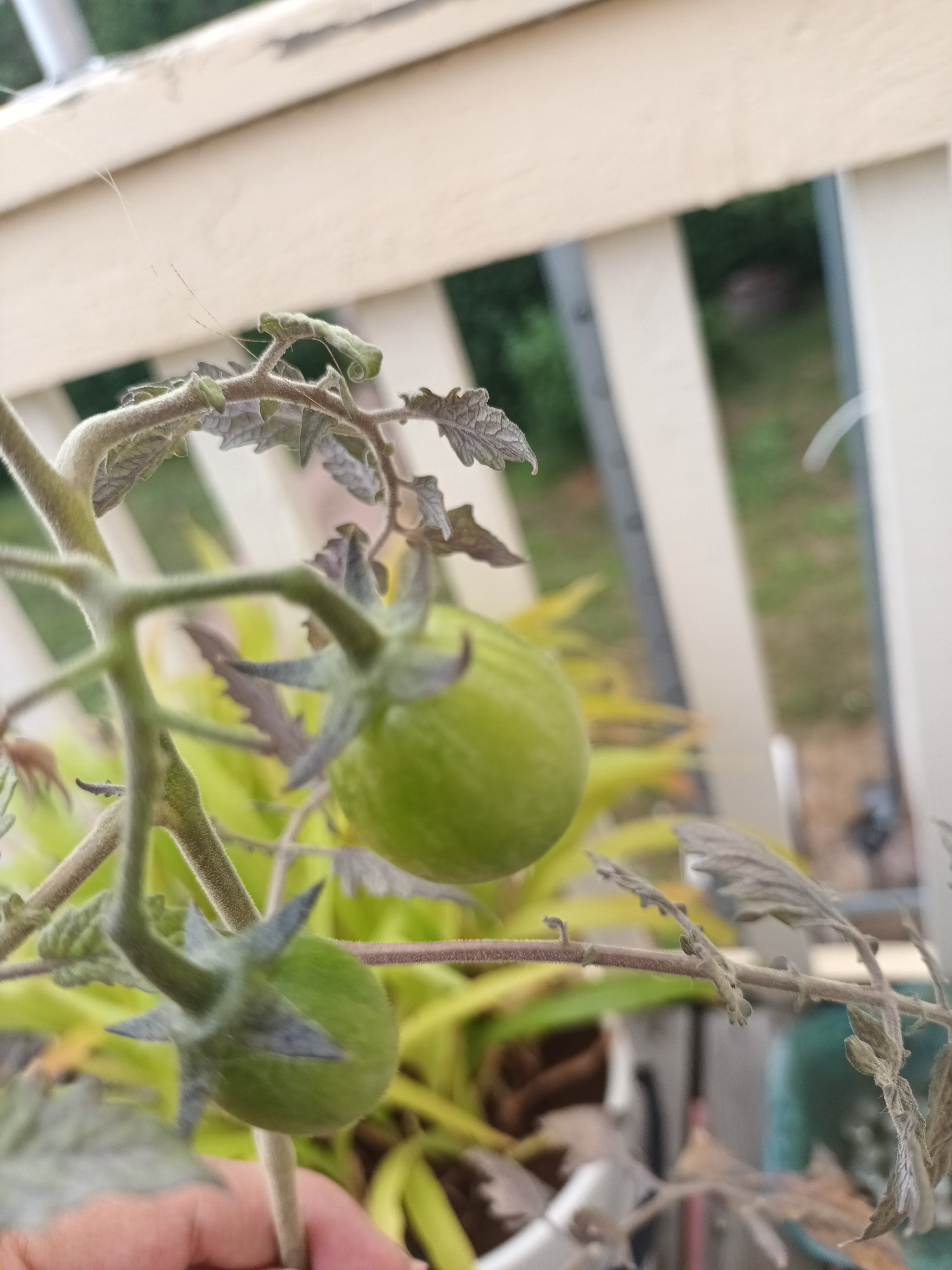 Efter att två tomatplantor inte riktigt fick någon chans att överleva pga bl.a. ivriga barnfingrar har jag nu en tomatplanta som fått växa upp och nu ser man att det faktiskt kommer att bli tomater på den.
