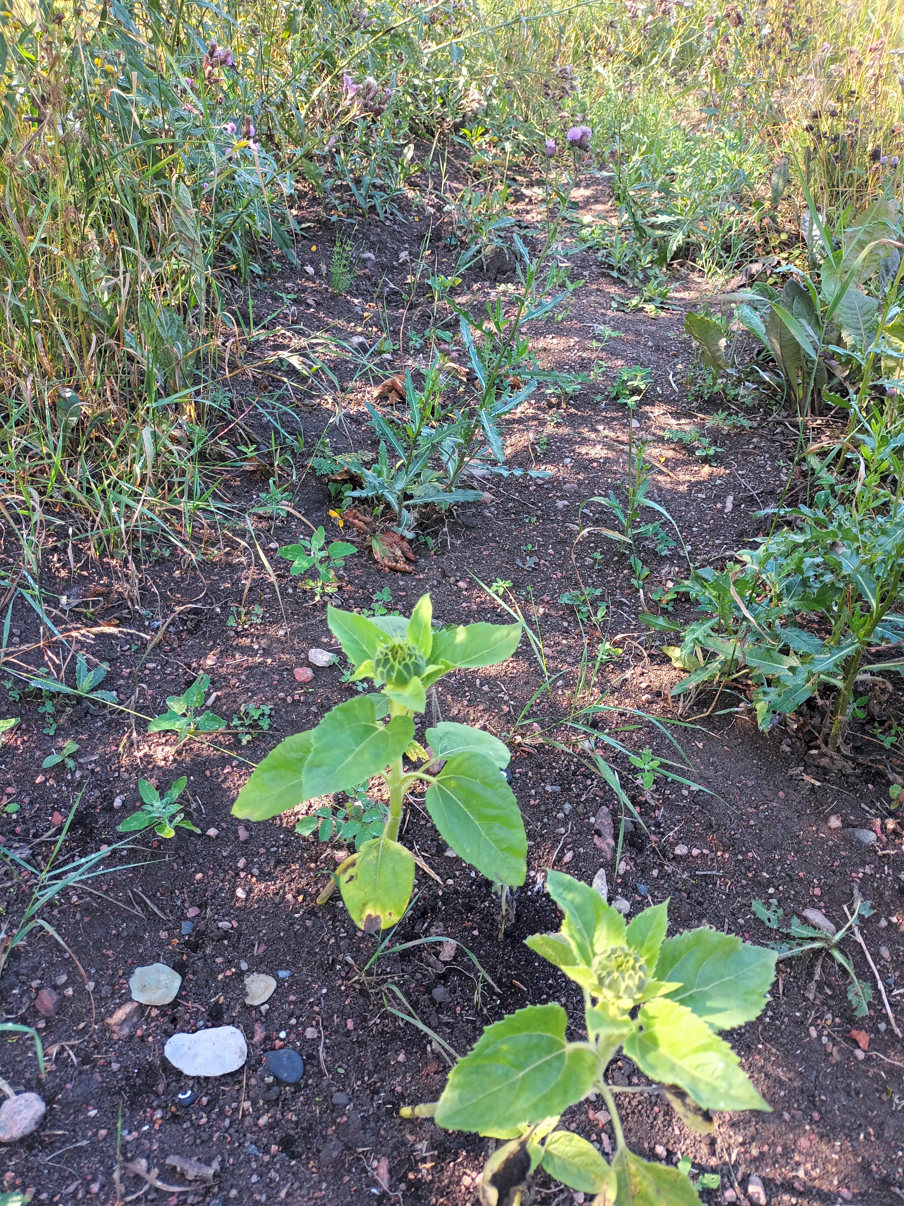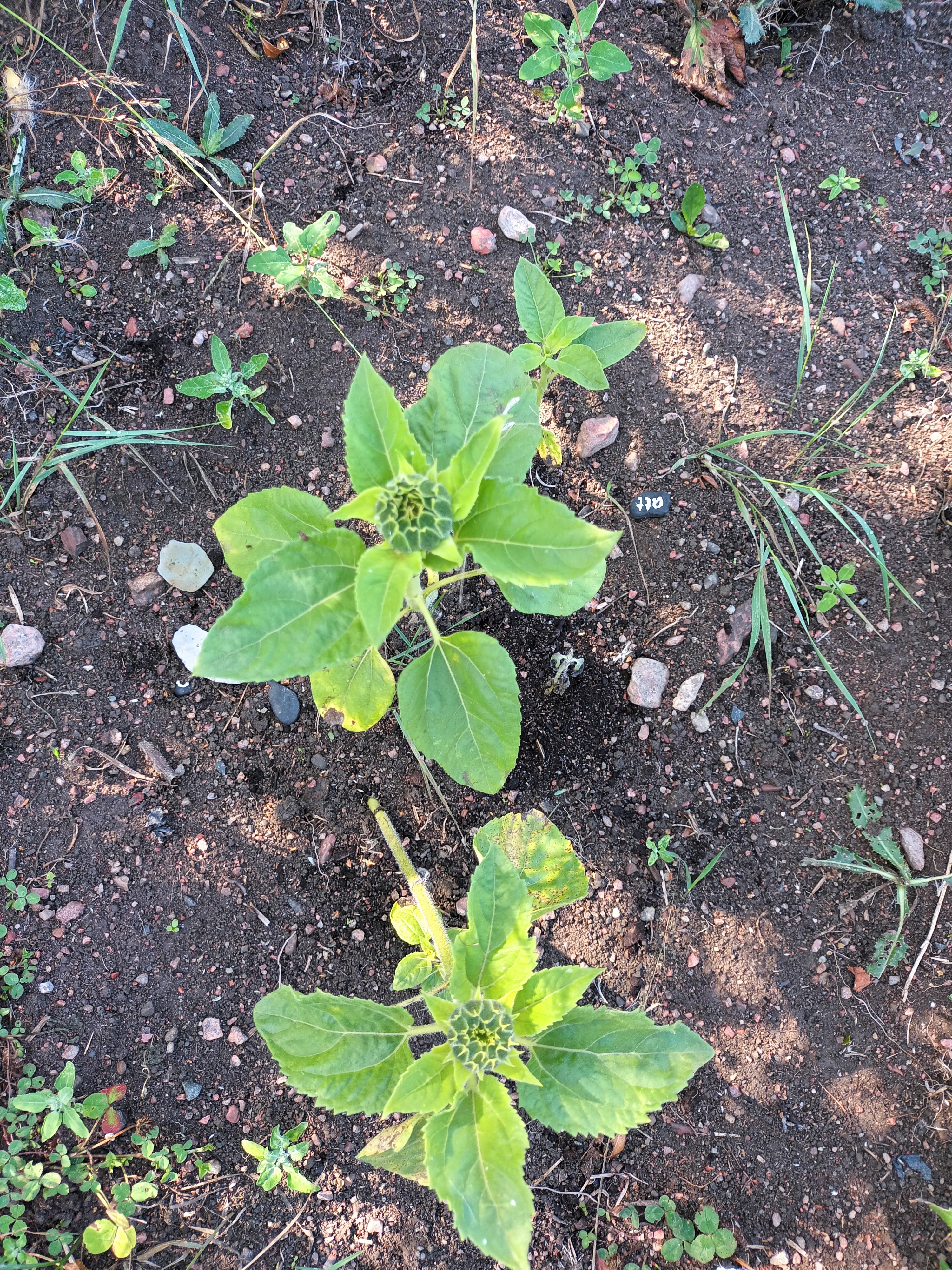 Under maj och juni månad sådde jag solrosfrön i krukor hemma och planterade sedan ut plantorna vid odlingsmarken vartefter de växte upp till små plantor. Det var inte så många solrosplantor som klarade utplanteringen i början. Jag borde kanske ha väntat med att sätta ut den första omgången och vattnat mer i början då det var så torrt. De plantor som jag satte ut längre fram under säsongen ser ut att ha klarat sig bättre och det ser ut som att minst två plantor har en knopp och kommer att blomma snart. Kul!
