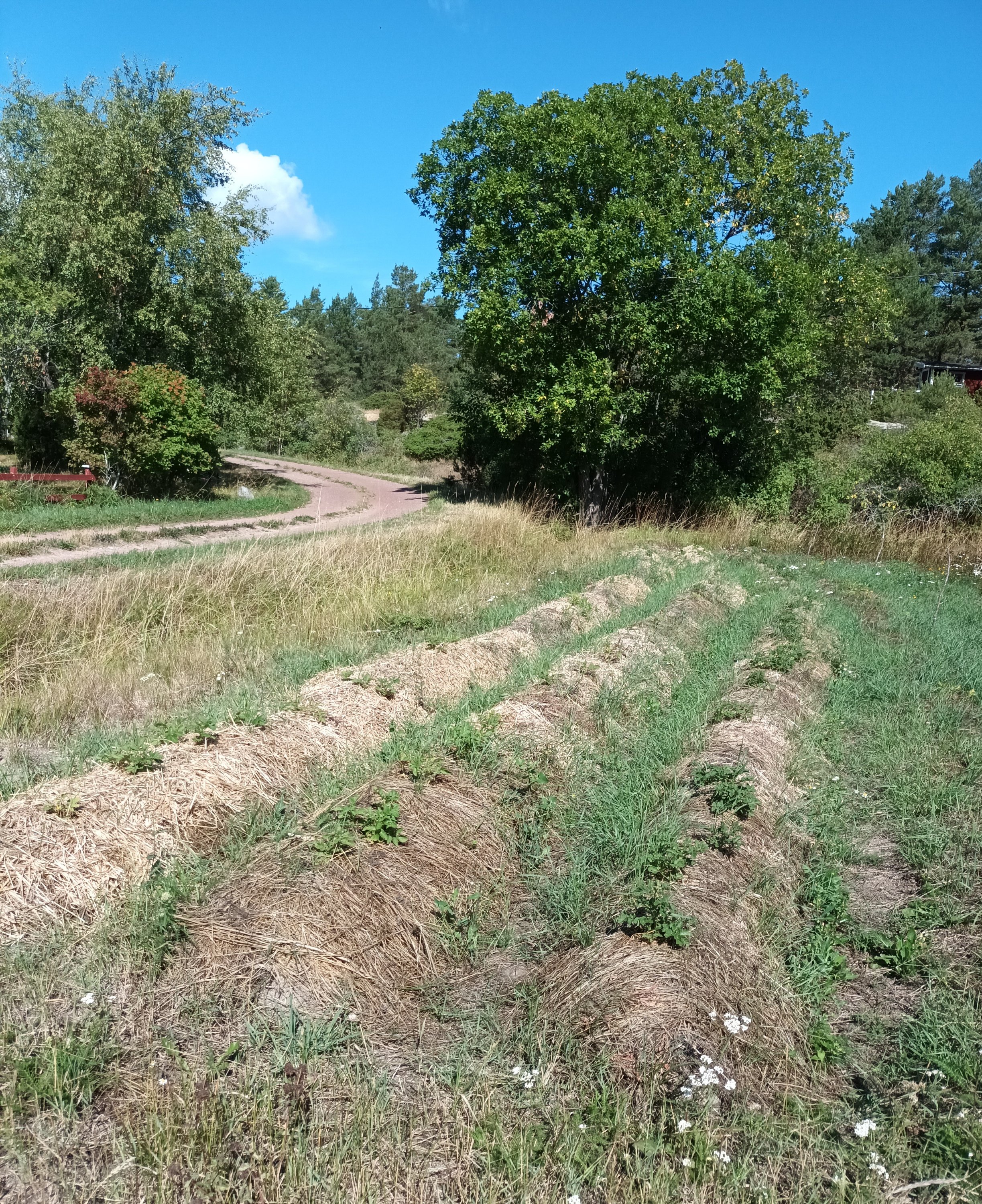 Tillsammans med några andra familjer här på skärgårdsön har vi fått möjlighet att använda en liten åkerlapp. I vår gemensamma samodlingsdel av marken har vi täckodlat potatis.