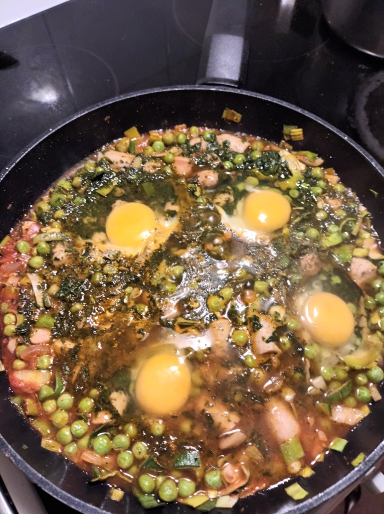 När grytan är klar, knäck i äggen. Shakshukan ska vara så tjock att du kan göra små gropar där du knäcker i äggen. Sätt på lock och koka några minuter till så att äggen blir klara.